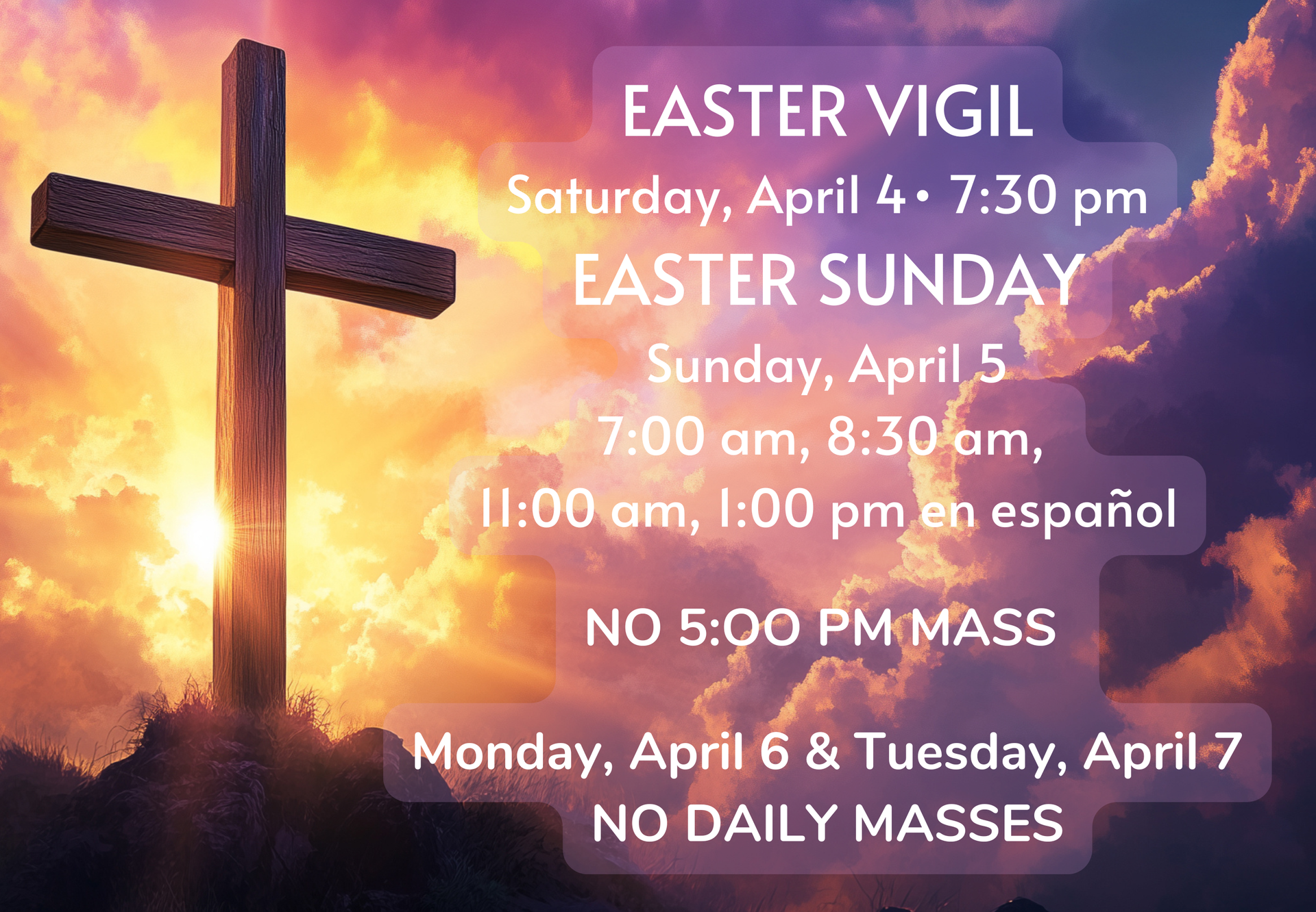 Adoration begins following the 9:00 am daily Mass - Benediction at 6:00 pm.